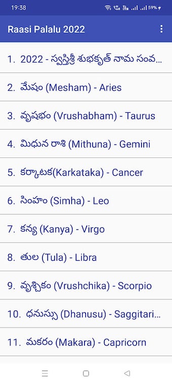 Raasi Phalalu adalah aplikasi Android yang menawarkan ramalan berdasarkan zodiak untuk tahunAplikasi ini mencakup informasi mendetail mengenai dua belas tanda zodiak dalam bahasa Telugu, termasuk Mesha, Vrushaba, Mithuna, hingga Meena. Setiap ramalan dirancang untuk memberikan wawasan tentang tantangan yang mungkin dihadapi pengguna dan cara menghadapinya. Pengguna disarankan untuk menggunakan informasi ini dengan bijak, terutama ketika berhadapan dengan orang yang memberikan kesulitan.